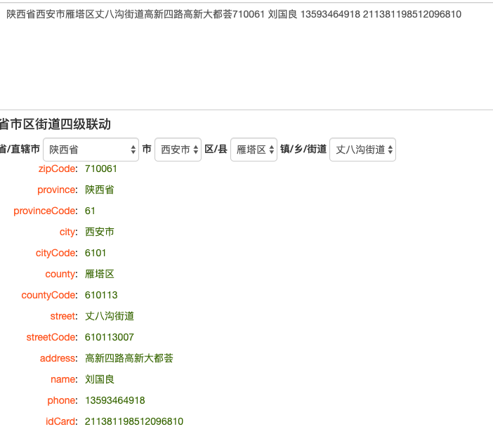 smart("陕西省西安市雁塔区丈八沟街道高新四路高新大都荟710061 刘国良 13593464918 211381198512096810")
